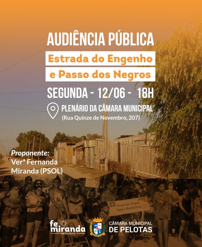 O mandato da vereadora Fernanda Miranda (PSOL) vem acompanhando as movimentações do empreendimento desde 2017, com a ameaça de retirada das famílias do local e as movimentações desse processo, cobrando providências do poder público quanto à realocação das trabalhadoras e trabalhadores que residem na Estrada do Engenho. Em decorrência do avançar das obras e da falta de informações mais precisas e transparentes, foi solicitada a audiência pública para o dia 12 de junho, visando trazer o debate democrático entre todas partes envolvidas como representantes do poder executivo, moradores e sociedade civil. O encontro deve contar com representantes do IPHAN, UFPel, OAB, Conselhos Municipais e outras entidades.